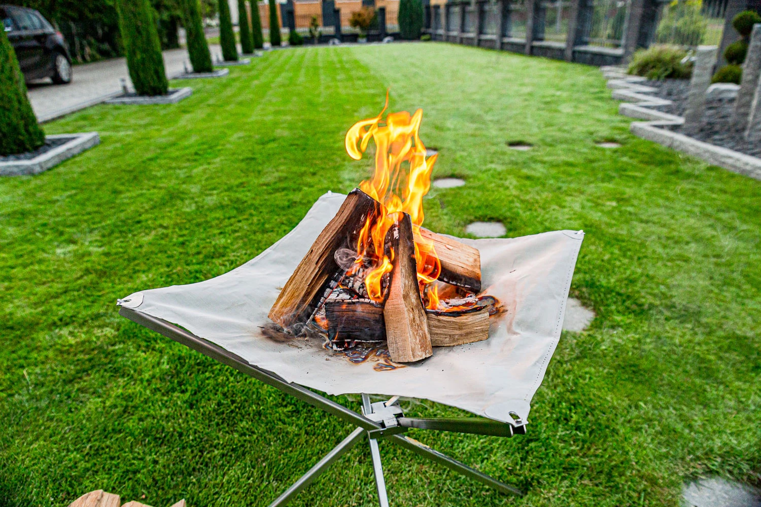 Für die Verwendung des Feuernetzes wird dazu einfach das 4-beinige Edelstahlgestell auseinandergezogen und anschließend das Edelstahlnetz an den vier Aufnahmen des Gestells eingehakt. Schon kann die Feuerstelle in Ihrem Garten oder der Terrasse platziert werden und die Holzscheite auf dem Netz aufgelegt werden. Da das Feuer von allen vier Seiten wunderbar Luft ziehen kann, erhalten Sie ein kräftiges brennendes Feuer, was Ihnen an kalten Sommerabenden wärme spendet.