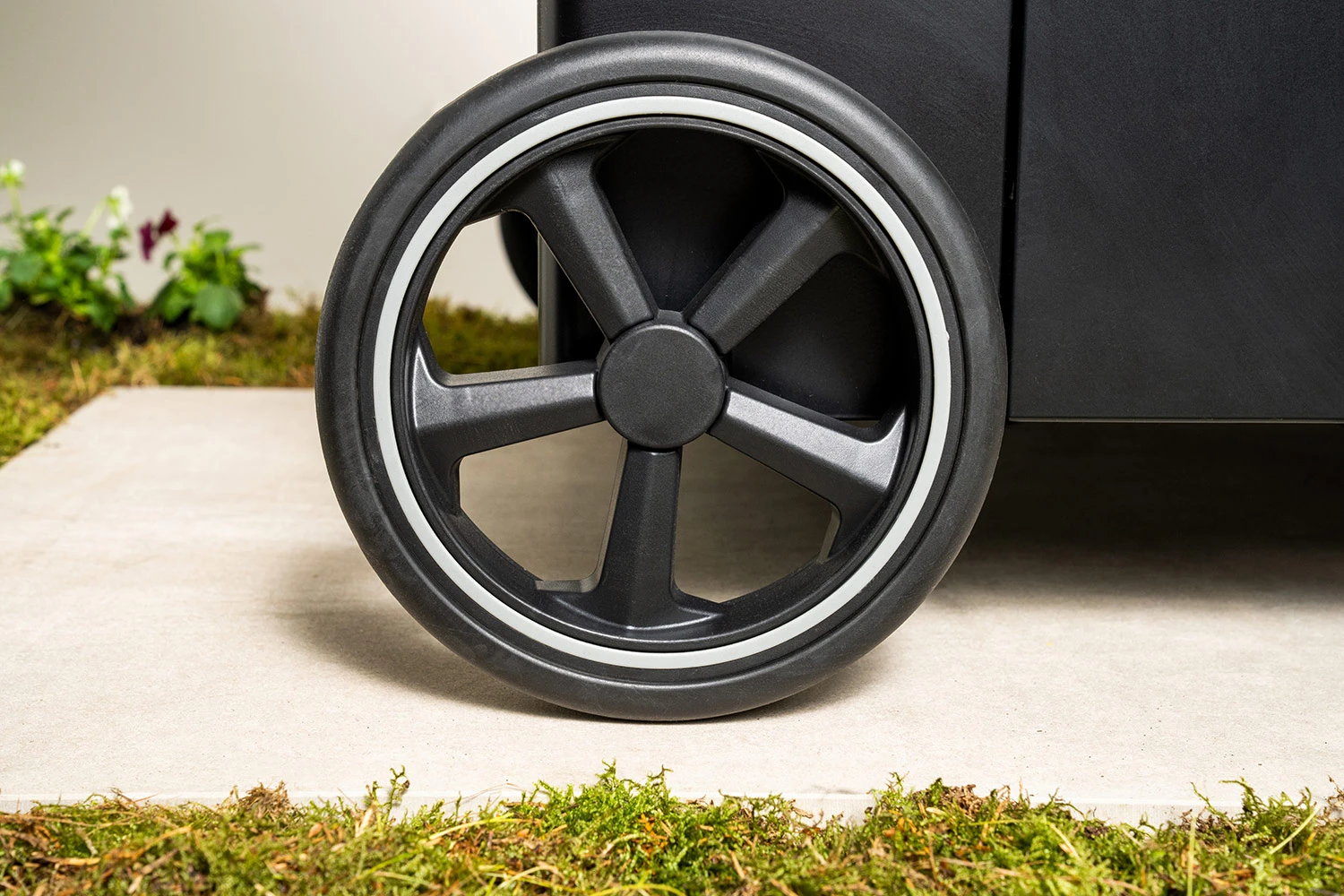 - große, gummierte Laufräder und höhenverstellbare Standfüße