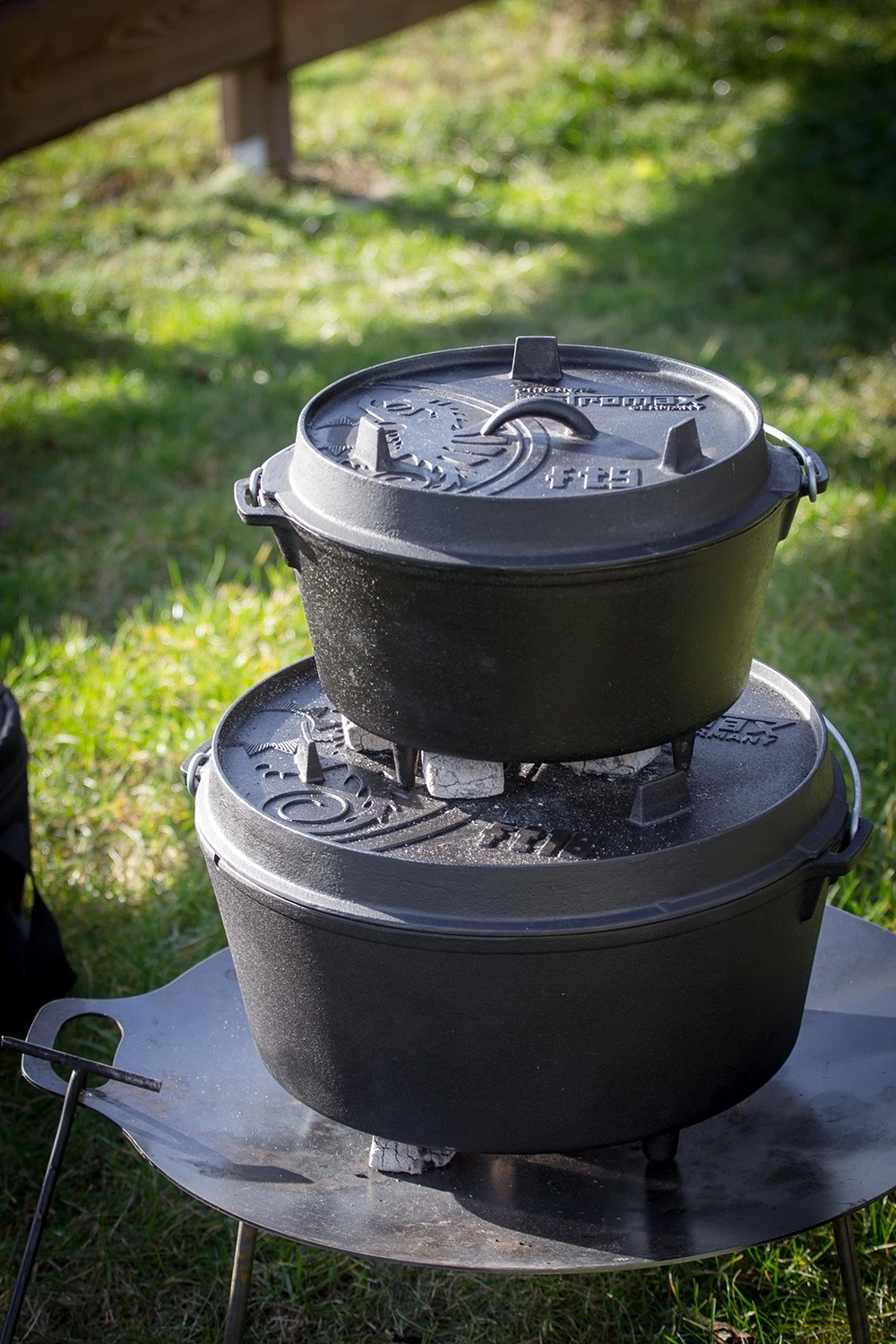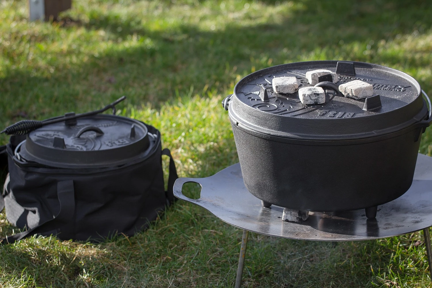 Für Gerichte, die Oberhitze benötigen, können Sie auch auf dem Deckel glühende Kohlen platzieren. Dieser besitzt hierfür extra einen umlaufenden Rand, damit die Kohlen auch beim Anheben des Deckels nicht herunterrutschen können.