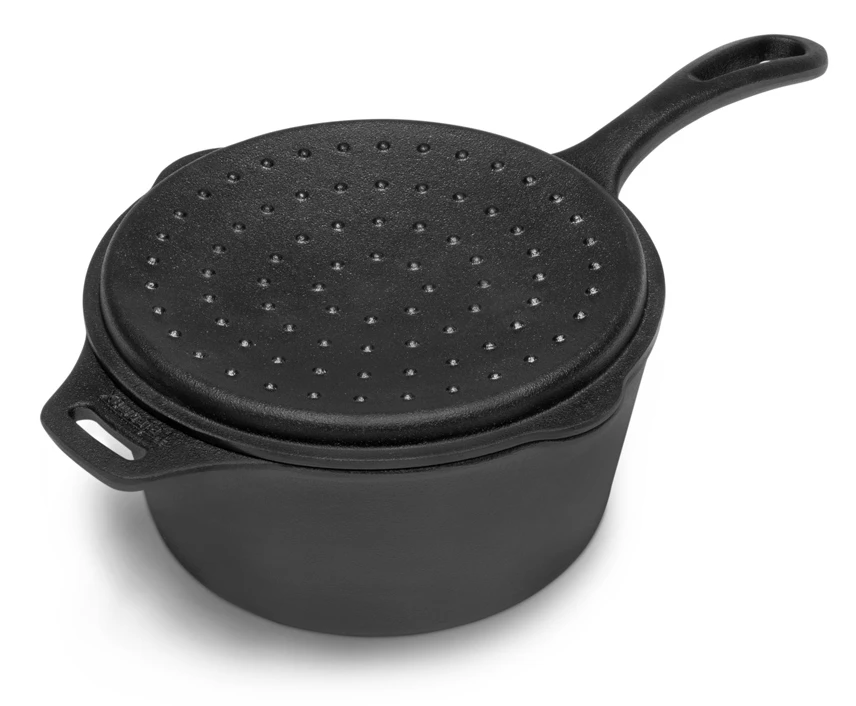 Gusseisen eignet sich besonders gut, um auf nahezu allen Hitzequellen eingesetzt zu werden. Damit das Hantieren und Servieren genauso einfach bleibt wie die Zubereitung, besitzt die Kasserolle einen handlichen Stielgriff und 2 seitliche Ausgießer zum Servieren von zB. Sauce.